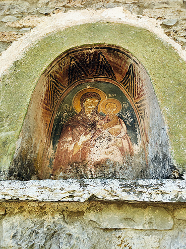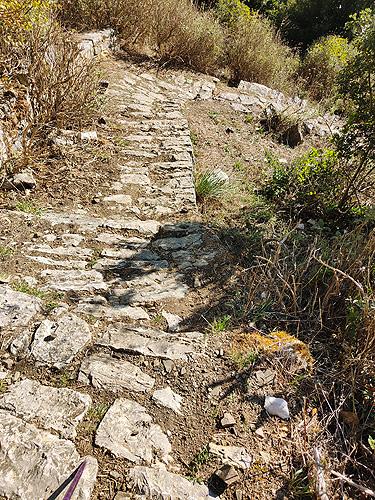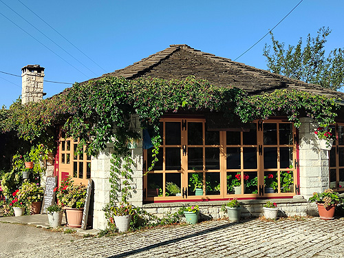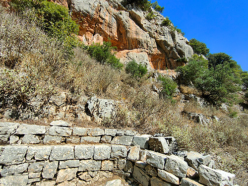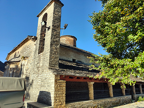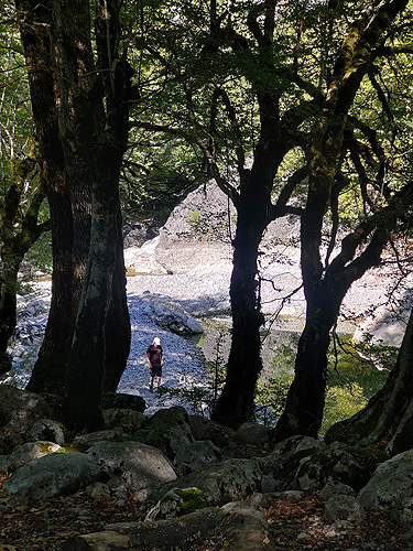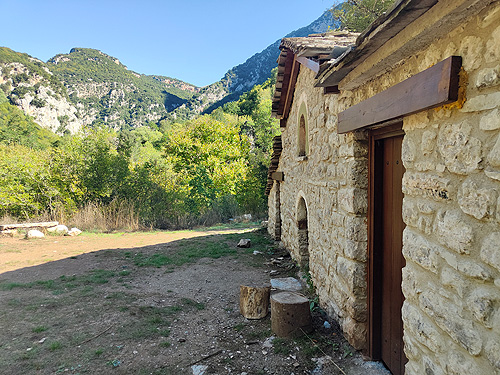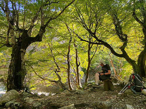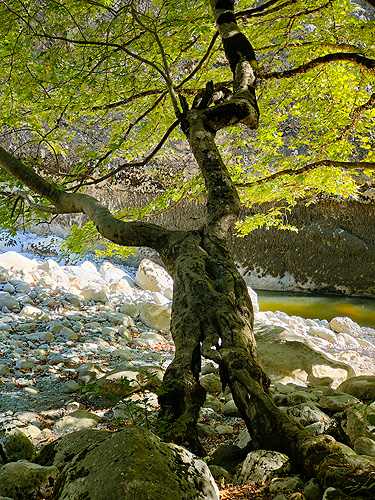 Abans d'agafar el camí, que surt de la carretera d'accés a Vikos, passem pel Mirador de Vikos. Xulíssima la vista de tot el barranc. El sol de cara no deixa que les fotos surtin millor, però l'ull ja ha vist el que havia de veure. Ens les prometíem bé i anàvem equipats amb banyador, tovallola i escarpins. Però quin fustre. Hi havia tant poca aigua que estava estancada, per no dir podrida. Ara bé, l'espai, les parets, sota els arbres, era fanstàtic, molt reposat, de molta pau. Si no hi ha bany, tornem cap a Vikos. Cerveseta al bar que està obert i marxem cap a Monodendri, l'altra punta del congost de Vikos. |