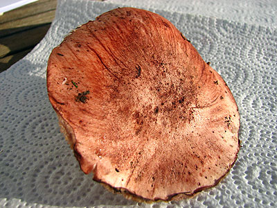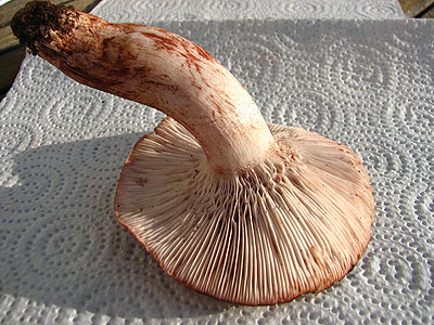 Làmines adherents, sinuoses, blanques però tacades de rosa brut. |