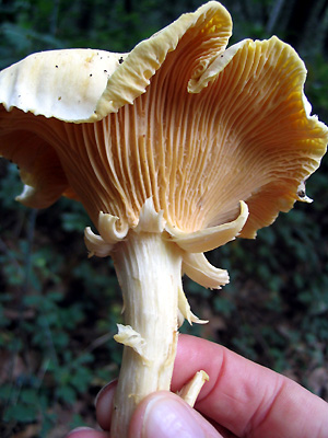 Omphalotus olearius: color taronja-vermell viu, làmines sota el barret, creix en grups sobre arbres. Tòxica. |