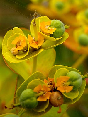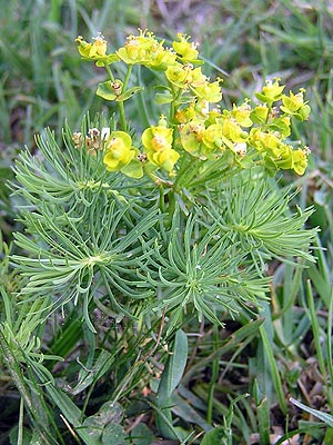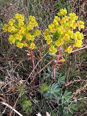 | Tija vermellosa, principal característica. Fa com un arbust. Fulles lanceolades disposades en forma d'estrella enlairada. Les flors, grogues i crases, estan progregides per unes fulles anomenades bàctrees. En alguns casos es podria confondre amb el marxívol |
