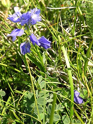 | Les flors surten directament d'una tija quasi "leñosa". Els sèpals són de color blau més fort i es confonen amb la corol·la -queda clar en la foto que es veu la flor més de detall. Les fulles són lanceolades quasi linears. |