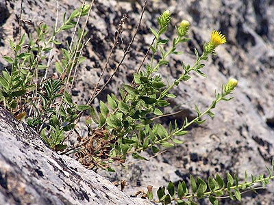 | Surt directament de la roca. . Planta amb propietats medicinals per al mal de panxa. . Se'n troba en zones seques i en petites quantitats. . Floreix al final de l'estiu. Flors grogues i petites. |