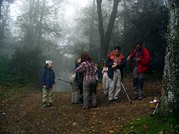 . Un parell de falsos rovellons que són tòxics. Cap rovelló ni pinatell, de fet, no hi havia pins. . Un alzinoi -armillaria mellea- . Dos tipus dels que tenen esponja, (ceps o siurenys), uns mollerics i uns que tenen el barret més ataronjat. . Apagallums -macrolepiota procera- de diverses mides, tot i que les més grosses ja estaven una mica passades per sota. També algunes que tenien el peu més llis. . Xampinyons vam trobar al jardí de la casa del rector i de l'ermita de Sant Martí del Montnegre. Devien estar beneïts però tot i estar bastant segurs del que eren -agaricus albertis- no ens els hem menjat. Alguns realment feien olor a anís, altres no. . Dues amanites mortals, -amanita panterina- marronosa amb piquets al barret, i altres dos comestibles amb reserves -amanita vaginata- que té, tot al voltant del barret estries de quasi 1 centímetre i sense volva. . El que podria ser un rossinyol -Cantharellus cibarius- molt gran, més de 10 centímetres de diàmetre. De fet hi havia tres però només vam agafar un. . Una llanega -hygrophorus latitabundus- que seria a confirmar. . Rússules vàries, bromoses vàries i altres sense identificar. Una petita caminada La sortida va ser curta, un dia boirós i plujós al Montnegre. Erem els 8 que jo anomeno nucli dur, els Gabarró-Solanas i els Moya-González. Primer esmorzar i conversa amb la informadora del Parc Natural que no havia pujat mai al Turó Gros, el punt més alt del Montnegre i que nosaltres vam decidir atacar tot buscant bolets. No vam arribar perquè la boira ens impedia veure res més que les nostres mateixes passes i les palomes que hi havia al mateix marge de la carretera