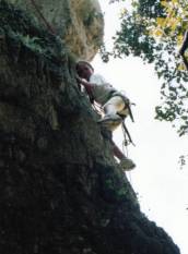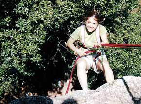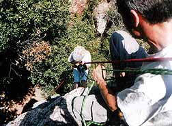 Ja hi som. Ens instal.lem i comencem a treure material. Primer puja el Lluís i instal.la la reunió perquè els altres puguem pujar assegurats. I ho fem per aquest ordre: Juanjo, Rut, Gemma, Adela, Berta i Marta. No és que la Sandra no hagi pujat, és que està de campaments i no ha vingut. S'ho està passant molt bé amb els seus companys del CAU, pujant al Puigmal i al Puigsacalm. Malgrat això, no hi ha arnesos per a tots i ens els hem de passar uns als altres. Sort que teníem el nou de la Sandra que se'l va comparar per anar a l'Aneto i no el va fer servir pal pas de Mahoma, què valenta... Tots pugem bastant bé fins i tot els que, com l'Adela, diuen per endavant, que li fa por el rappel. La Berta i la Marta pugen juntes amb una corda cadascuna. Però el cert és que a la Marta no li feia falta ningú. Va ser l'única que va trobar, tota sola, la bústia que hi ha a dalt de tot per posar la ma.