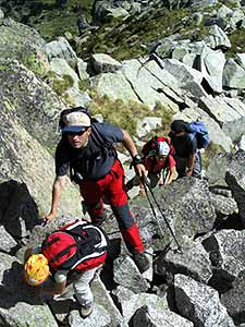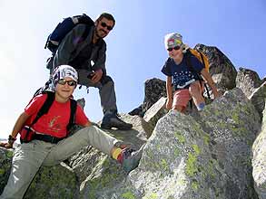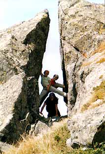De nou al coll, s'imposa la idea de no tornar pel mateix camí. Sabem que la volta és gran però... en direcció oest rodegem el Roc Blanc, d'entrada sense perdre gaire alçada. Seguim fites i hem d'atravessar una gran pedrera desgrimpant passos algo difícils en ocasions. Però ho hem de fer. Cal que enllacem amb el GR-7 a uns 2.275 metres on el GR-7 i el GR-7B s'ajunten o se separen, depen d'on vinguis. La baixada del coll és dreta, molt dreta, destrossa els genolls, sort tenim dels pals. Abans d'arribar als bosquos, una sorpresa. Un grup de pedres, estratègicament situades ens permeten fer una parada festiva. I serveix per tot: per descansar, per fer una mica d'escalada, per calmar els ànims de les que ja estaven molt cansades, per menjar una mica, i per fer aquestes piruetes i aquestes fotos.