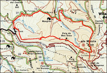 | Un cop hem deixat el cotxe, seguim sempre les marques del PR que ens acompanyaran quasi tot el camí d'anada. Primer començem per una pista en mal estat pel cotxes i de bon fer a peu que va pujant sense gaire dificultat. De sobte arribem a un cruïilla de camins i hem d'estar al cas, trencar cap a la dreta, seguint sempre les marques del PR. El camí es converteix en un empedrat, es comenta que era un camí romà o un camí ral. El camí puja en mig del bosc. Al cap d'una estona arribem al Masgrau, una casa de pagès que el dia que vam anar nosaltres hi havia dos cavalls. Després del Masgrau el camé es bifurca i no hi ha marca del PR, agafem el de sota i de seguida tornem a trobar les marques. Desde Masgrau es veuen unes antenes de TV. És la part alta del nostre itinerari. Comencem a davallar una estona fins que trobem una altre cruïlla que ens marca diversos camins, nosaltres seguim el PR i tornem a pujar per una pista en bon estat que ens porta a dalt de la carena que separa vers Vilanova de Sau. Si mirem entre mig dels arbres la vista ja és molt bona. Aquí a dalt de la carena ens trobem una pista asfaltada o pavimentada. L'agafem a la dreta seguint les marques del GR-2. Aquestes marques -vermelles i blanques-, després d'unes quantes curves en forta pujada i de passar per la casa dels Munts, que té a darrera les antenes, ens porten fins a un mirador, és el Salt de la Minyona. Les vistes són impressionants, la alçada també, fa vertigen aproparse a la barana. El camí continua davallant per la pista asfaltada. I tot i que de seguida que sortim del mirador trobem que el GR-2 trenca cap a l'esquerra, nosaltres seguim davallant per la pista fins que trobem el camí que venia del Pont del Vent i trencant cap a la dreta en pocs metres enfilarem nou cap al cotxe. |