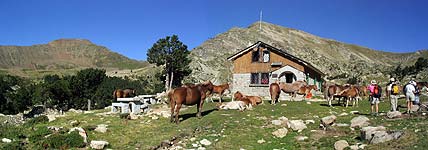 Idílica imatge del refugi dels estanys de la Pera amb els cavalls i el Perafita just al darrera. I a l'esquerra, separat pel coll de Claror, el Monturull. |