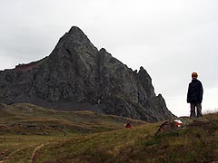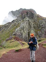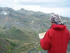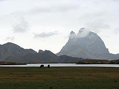 Aleshors comença la pujada tot seguint un rierol. Les primeres gotes ens agafen abans d'arribar a l'Ibón d'Anayet conegut, sobretot, per la vista que té sobre el Midí d'Ossau. El Midí el deixem per un altre dia El lloc i el paisatge és realment impressionant, tot i que avui no seria el millor dia, més aviat era força dolent. Descansem una mica, quatre xuxes i amunt. Tenim l'Anayet a tocar, pero queda un fort desnivell que es salva en molt poca distància. La Rut i la Marta arriben al coll i fan efectiva la seva decisió, elles no feien cim. Comencen a baixar enmig de la boira, s'arreceren a sota d'unes roques quan plou una mica més fort i busquen un bon lloc per dinar. El Lluís i jo decidim continuar fins al Vértice (a l'esquerra del coll). El terreny està mullat i no hem agafat material per assegurar-nos i poder fer l'Anayet amb tranquilitat. Hi ha alguns petits trams que, si rellisques, pots tenir conseqüències molt desagradables.