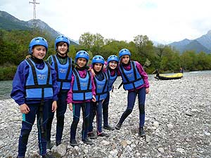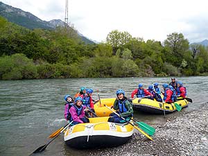 Havíem quedat molt d'hora, sí, potser massa, de manera que al final cada família va anar pel seu compte i ens vam trobar a Campo (Osca). Era la primera parada del viatge. Una baixada en rafting ens esperava. Nosaltres vam baixar amb TT Aventura però hi ha vàries a la zona (Aguas Blancas, EKM, etc.) que també ofereixen altres tipus d'activitats com baixades de barranc, escalada, senderisme, etc. Per a les nenes era la seva primera vegada i estaven contentes de poder probar-ho. El cel amenaçava però ens va respectar fins que ja vam ser al restaurant Cotiella (molt bó i a un preu raonable) per dinar. La Pilar i el Miquel no van fer rafting i van pujar fins al refugi del Turbón. L'Adela i la Gemma tampoc, i es van dedicar a gravar-nos en vídeo.