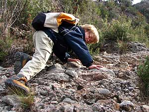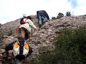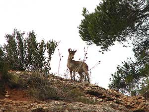 La caminadeta del matí, no arriba quasi ni a caminadeta, però... I malgrat que la diuem al GPS de la Berta i també a la de l'Ignasi, just en el moment d'agafar el camí, ens vam equivocar. Però millor. Encara no ho he dit, volíem anar fins a la cova de l'Arcada des de la masia El Castell, del Bruc. El que vam fer és seguir les marques rodones vermelles i la pujada la vam fer grimpant en comptes de per la riera. Una mica més complicat, sobretot per a la Meritxell, però més xulo. Agafada l'alçada vam franquejar una mica camp a través fins el camí. El descens sí que el vam fer per la riera i, per a sorpresa nostra, vam trobar 3 isards.
