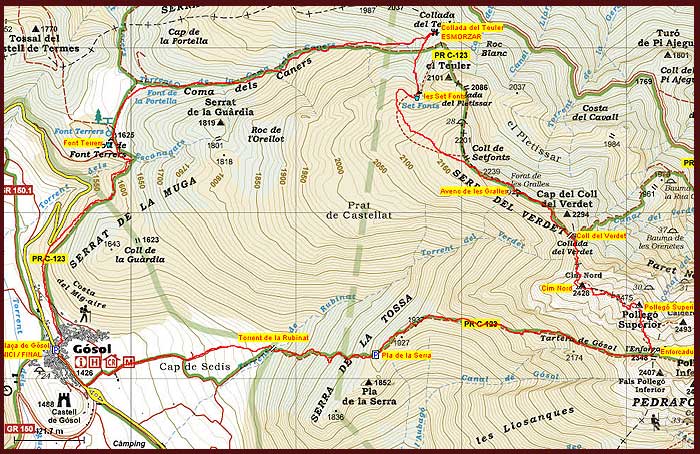 Comencem a ritme fort, potser massa i algú del grup es queixa. Passem per un corriol direcció nord i ens trobem amb una pista i una zona de picnic, es diu la font Terrer. Aquí fem una petita parada ja que em fan mal les botes i les canvio. Continuem pujant. El camí està molt marcat per marques de GR i de PR, però quan es separen continuem per les de PR. Es tracta del PR C-123 Ens ha de portar fins al coll del Verdet on es baixa pel camí utilitzat per la gent per pujar des del mirador del Gressolet. Aquest es un camí molt maco i que té una pinta de bolets... encara que ara no hi ha. Està tot molt sec. Ens trobem un boletaire despistat, no sap tornar al cotxe. L'indiquem com sabem i sembla que arribarà.