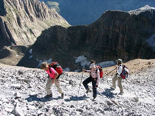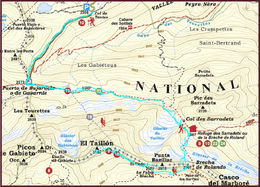 Passada la Bretxa girem a la dreta cap al Taillon. Anem vorejant la muntanya per la vessant espanyola. El camí està força marcat. Arribem al Dit i a la falsa Bretxa. Ara passem a la part francesa i es veu el glaciar del Taillon, el coll de Serradets i només ens falta l'últim tram, durillo però com que ja es veu el final. Tornar a ser pedreta molt petita però quasi no rellisca.
