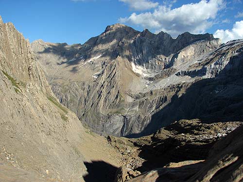 | Ja es veu a l'esquerra l'inici del Taillón, queda molt poc. Si mirem a la dreta, veiem el coll de Sarradets i una part de la glacera que queda. El refugi es troba darrera de la paret que es veu a les fosques. |
