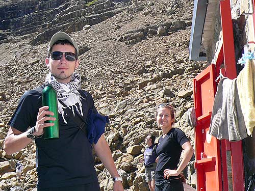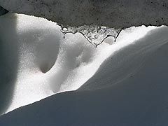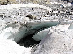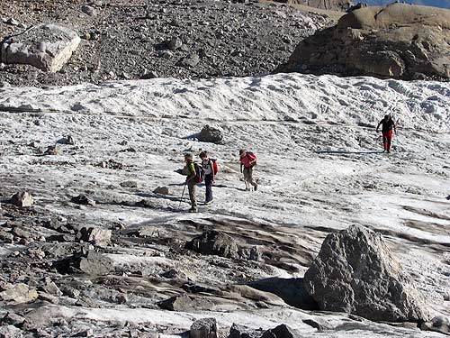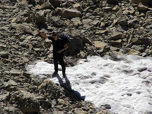 | Per passar la glacera, com ens havíen dit des del refugi no calien ni crampons ni piolet. Millor per nosaltres (s'elimina bona part del perill d'aquesta ruta) però pel conjunt del medi ambient és dolent. En Miquel va saber trobar la part artística. |
