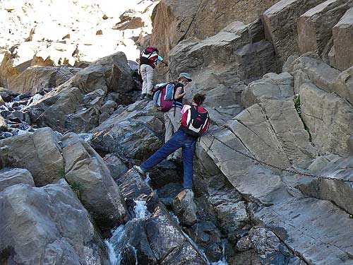 | El camí fins al refugi té tres trams bastant diferenciats. El primer, és la carretera. El segon, ja enfilats a la falda del Taillón, puja molt suaument mentre trobes cascades que baixen del cim. I en el tercer és on es fa el desnivell fort. És en aquest s'ha de travessar un rierol que forma cascades. La qüestió és que el camí passa per enmig de l'aigua. Hi ha una cadena per ajudar-se encara que quan no hi ha gel (com era el cas) es pot passar amb le mans a les roques sense problemes. |