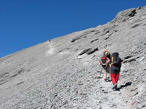El camí és tant clar com el que ens ha portat al refugi. La Bretxa la tenim just a davant. Cal pujar per la tartera fins arribar al resalt de roca. Travessem el que queda de glaciar de la Bretxa i enfilem la Bretxa per un camí que fent esses ens puja també molt ràpidament. Només al final has de decidir per on es va, quin tram és el més assequible.