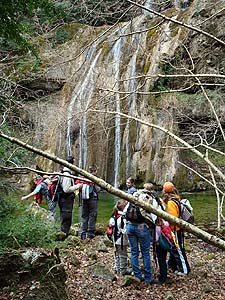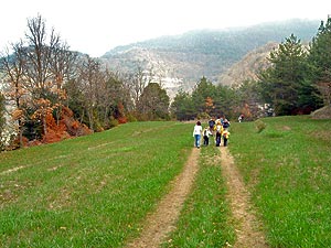 Passada la cascada és quan ens emboliquem. El camí més evident és anant cap a l'esquerra com, per cert, fa l'Àngela, l'avia de la família de Gurb. Però el paisatge s'obre i ens sembla que no pot ser. Així que decidim passar per una porteta que hi ha en una tanca metàl·lica -erroooor- Anem pujant fins a trobar un gran prat i la pista que passa per sobre de la cascada. Pensem que és un bon lloc per dinar -i ho hagués estat si fos el camí correcte-. Segon error que fem, en comptes de tirar cap a l'esquerra seguim endevant a la vora d'una altra riera més petita. Resultat, seguim pujant de manera que ens trobem a la part superior de les baumes. Trobem una pista -anem en el mateix sentit que l'aigua de la riera- fins a una casa abandonada -el Burbau-. Amb l'ajuda del mapa ens situem i busquem corriols de baixada. Ens endinsem en un d'ells fins a sortir a una pista inferior que passa just a sobre de la bauma del Teixidor. Caminant de nou com l'aigua de la riera trobem un indicador en un camí de baixada: B.S. a 900 mts. Fem la broma, Berta Solanas a 900 mts. El que està a 900 metres és la imponent bauma del Teixidor, habitada fins fa 50 anys, i una pollancrera que li feia de jardí.