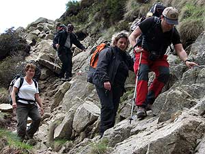 Montse Torres, Ignasi, Montse i Juanjo, superant el pas més complicat del recorregut amb cable per agafar-se |