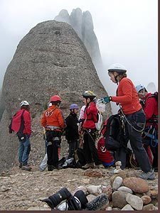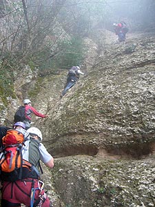 Al inici de la xemeneia hem arribat a les 13:30 hrs. I l'últim en arribar al mirador ho fa a les 15:00 hrs. En total una hora i mitja emprada per superar-la: hem hagut d'esperar que primer un grup que anava al davant la faci i després tots nosaltres hem passat darrere. Al final arribem tots al mirador. Estem bastant contents, no hi ha hagut cap incidència important, encara que els dos nens han patit una mica en el últim tram de la xemeneia. Uns es queden a dinar al mirador, el Josep María munta el trípode i es dedica a filmar el rescat dels escaladors accidentats i els altres baixem. Uns cap al Monestir i d'altres directes a l‘aparcament de Santa Cecilia per dintre de la canal de Sant Jeroni. Hem sortit de l'aparcament a les 9.30 hrs i hi tornem a les 16:00 hrs. Hem emprat sis hores i mitja, de les que més de la meitat ha sigut temps d'espera. Massa gent per una ferrada. Lluís Gabarró |