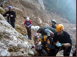 Continuem fent un llarg franqueig -altre vegada amb pedres, fang i arrels- per un camí força estret que recorre la paret oest de Sant Jeroni. Aquest franqueig no presenta cap problema, ja que els trams més complicats es troben equipats amb cables. Després continuem guanyant alçada per plaques força inclinades equipades amb cables i cadenes. Al final arribem a un petit coll. Mentre feien la pujada hem vist un helicòpter que no ha parat de donar voltes per la zona, com si busques alguna cosa. Al arribar a aquest petit coll descobrim que l'helicòpter a trobat el que buscava: uns escaladors que, segurament, han patit algun accident a la paret de la zona d'Ecos. Ens aturem una estona a contemplar les evolucions de l'helicòpter, moment que s'aprofita per reagrupar-nos.
