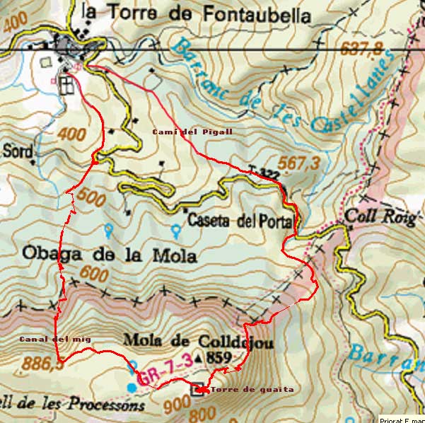 Passat el bosc d'alzines, comenceu a veure els molins d'electricitat. Sou ja a prop de la carretera, un altre trencall, aneu cap a l'esquerra i, de nou a l'esquerra quan arribeu a la carretera. Passat un petit collet (sense nom) el desviament a La Torre per camins. Nosaltres vam agafar el del Pigall. En 40 minuts, o menys, sou al poble de tornada. |
