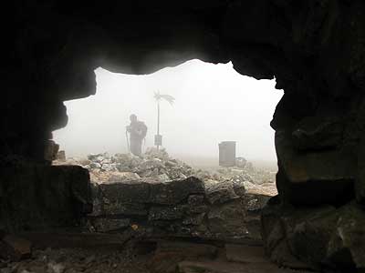 | Però realment, no es veia res. La boira anava i tornava i, a estones, plovisquejava. Si ens separàvem una mica, no ens vèiem. La font no la vam trobar, però si la torre de guaita i el llibre per signar l'ascensió. Allà van quedar els nostres gargots. Fèiem un recorregut circular amb sortida i tornada a la Torre. A la baixada vam passar per una cova que hi ha al GR-7.3 (els senyals, pocs i mal posats). Allà aprofitem per tapar les motxilles i treure anoraks, sembla que arriba la pluja. Però no era el moment de ploure i va durar només uns minuts. |