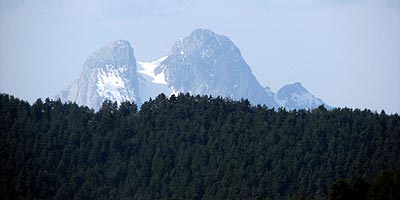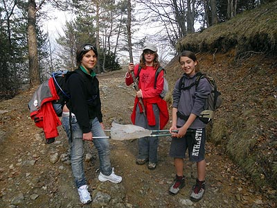Si fins ara anàvem per la banda sur, ara baixem del cim més aviat pel nord. És mot més escarpat i, el primer tram, demana anar amb molta cura. No només pel desnivell, també per les clapes de neu que trobem -l'endemà no seran clapes, quasi faran falta els paraneus- El camí cap al refugi fa una petita volta. El pas per un bosc de pi supernet ens fascina. Aquí ja agafem la pista que ens porta al refugi. El grup es separa bastant. I les nenes (Cèlia, Maria i Marta) trobem una interessant però freda joguina, un gran bloc que gel que transporten a la seva manera.
