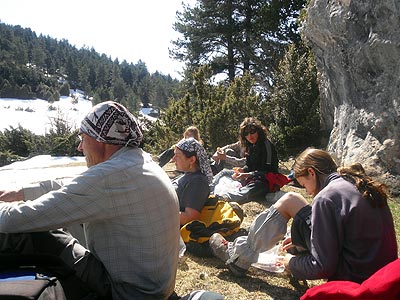 Piquem, dinem, xerrem. Una estoneta de calma sota el sol. També sentim, no cal amagar-ho, algunes queixes infantils. El camí canvia, ja no és una pista sinó un corriol estret. El paisatge es torna més dur, amb més desnivells, més boscos.