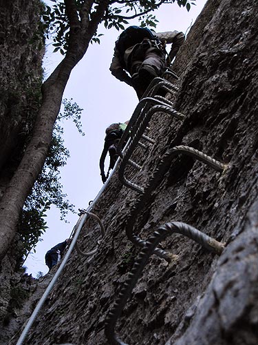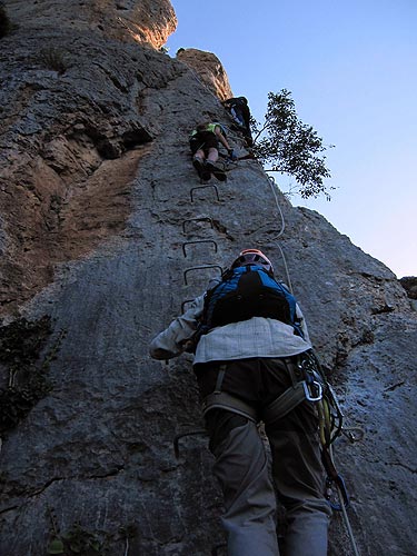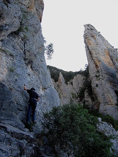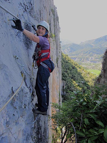 Aquesta ferrada està situada al poble de Foradada del Toscar, a peu de la N-260 -Eix Pirinenc- a l'extrem est del massís de Peña Montañesa. Es pot arribar des d'Ainsa per la citada N-260 i una mica abans d'arribar al port de Foradada del Toscar hi ha l'entrada a l'esquerra amb un eixamplament per deixar els cotxes. Si aneu en 4x4 podeu tirar per la pista i us estalvieu un quart d'hora-20 minuts de pujada. Està indicat. Les agulles es veuen des de la carretera. També es pot venir de l'altra banda, de la zona de Campo i Graus. En aquest cas, el camí s'agafa just després de passar el port. Primer anava la Rut -que se la sentia des de ben lluny-, després la Marta i el Lluís. I jo, la Berta, l'última. Així, si hi havia problemes, el Lluís ens podia ajudar a totes dues. No va fer falta. Aquí unes quantes fotos: