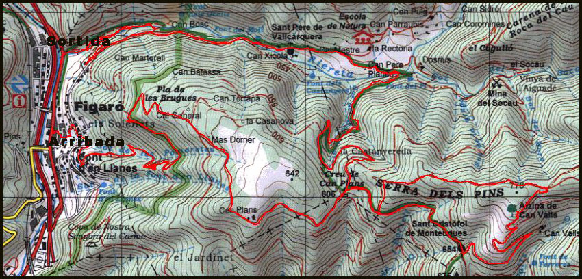 Al final del poble, venint des del centre de El Figaró, passem per sobre de la riera de Vallcàrquera i girem a la dreta per la pista que va paral·lela a la riera. Trobarem un primer trencall a la dreta que ens portaria a la carretera de l'escola de Natura però no l'agafem. Seguim i trobem una font, també a la dreta. Seguim fins a un altre pas de la riera que ens fa passar per sobre, girar a la dreta i agafar la carretera abans esmentada. Per aquesta arribarem a l'ermita de Sant Pere de Vallcàrquera i a l'escola de Natura. Aquí s'acaba la carretera. Agafem la pista de més a la dreta i travessem una riera. Continuem fent algunes ziga-zagues fins a arribar a un trencall de pistes on trobarem la Creu de Can Plans. Aquí tenim vista de la banda de La Garriga i el Vallès. Una opció és anar a la dreta i tornar a El Figaró.