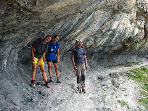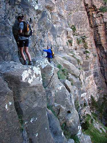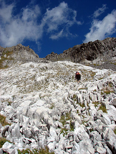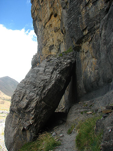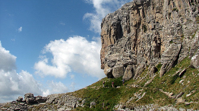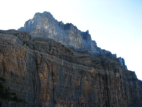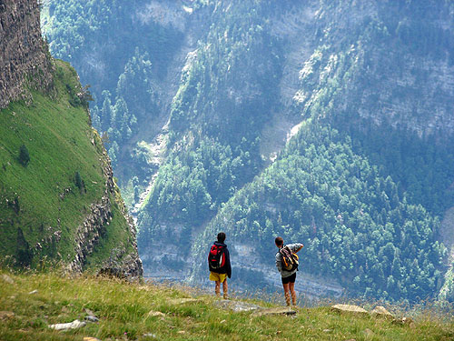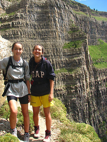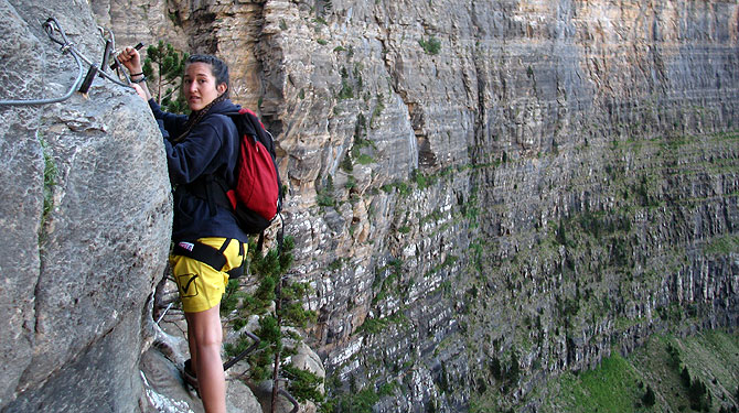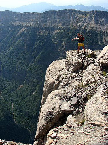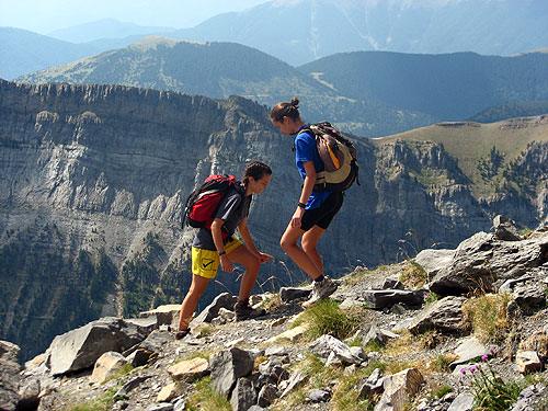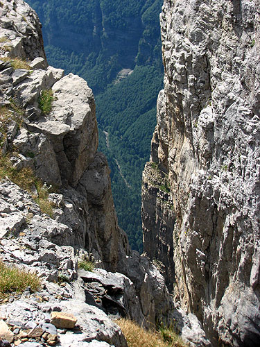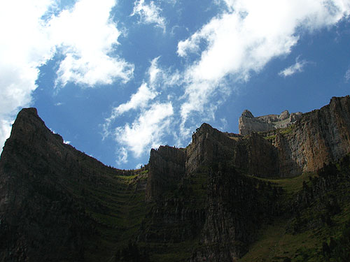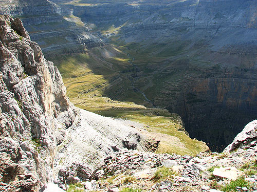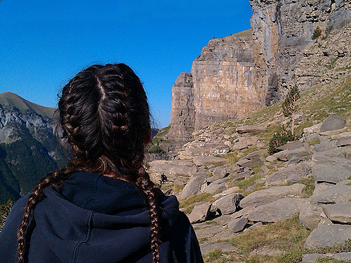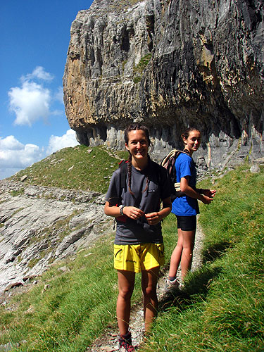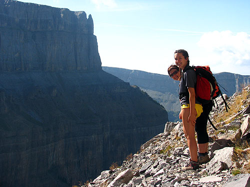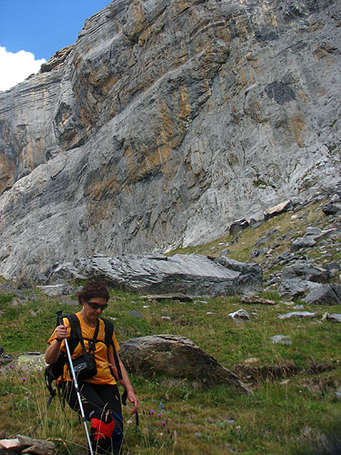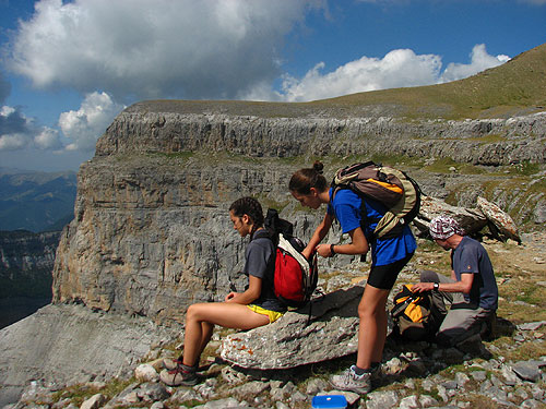 | Al final de la Faja de las Flores, mengem una altra miqueta, descansem, gaudim dels isards i ens preparem per a la baixada del circ de Carriata. El paredon que tenim a la nostra esquerra és impressionant. En total, són 1.000 metres de desnivell, que se'n diu ràpid. La baixada es pot fer per les "clavijas" de Carriata o bé per la "fajita". Escollim la segona opció perquè no portem cordes i aquestes "clavijas" no tenen cable de vida. Al llarg del camí anem trobant les altres dues "fajas" que conecten els circs de Cotatuero i de Carriata: la de Blanquera -per sota del paredon- i la de Racún -pel mig del bosc-. |