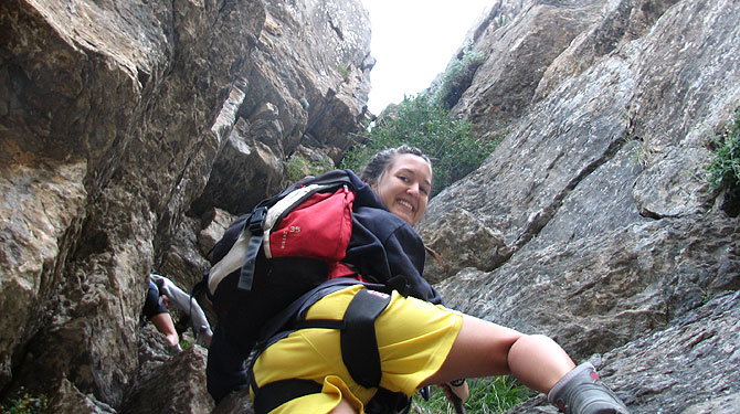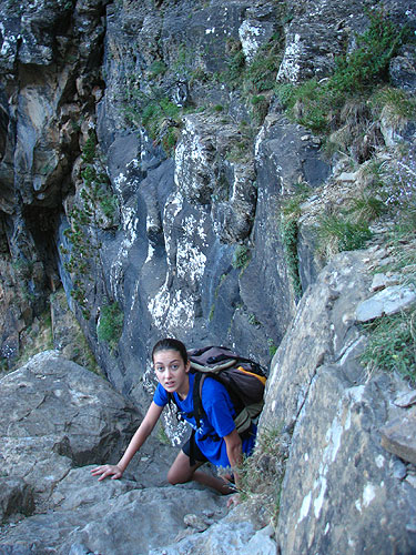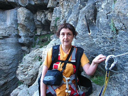 | La pujada la fem per Cotatuero i baixarem per Carriata. Las "clavijas" de Cotatuero tenen cable de vida. Les de Carriata no, però són opcionals. Portem a sobre els arnesos i els dissipadors per no tenir cap ensurt. Fa anys las vam baixar sense cable i sense assegurar i no ho vam passar gaire bé. |