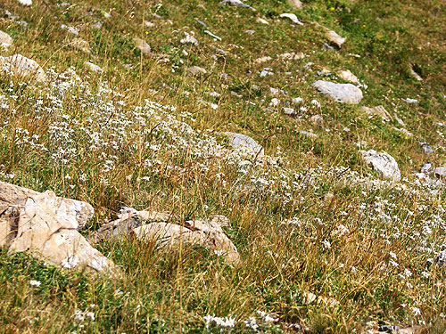 | Continuem perquè no pot ser tot rialles i fotos. El camí que queda encara és llarg, però no podem anar massa ràpids, primer trobem una parella d'isards, després una marmota i, per acabar, milers d'edelweis. Si a la "Faja de Pelay" vam al·lucinar, el que avui veiem no es pot descriure, milers de flors de neu, tantes que havies de vigilar per no trepitjar-les. |
