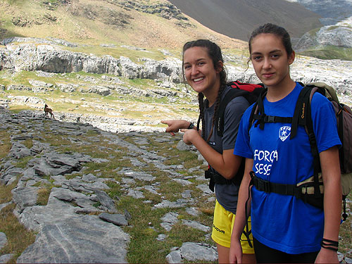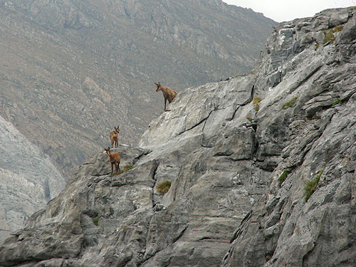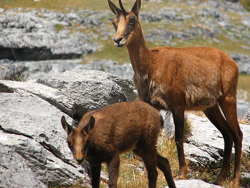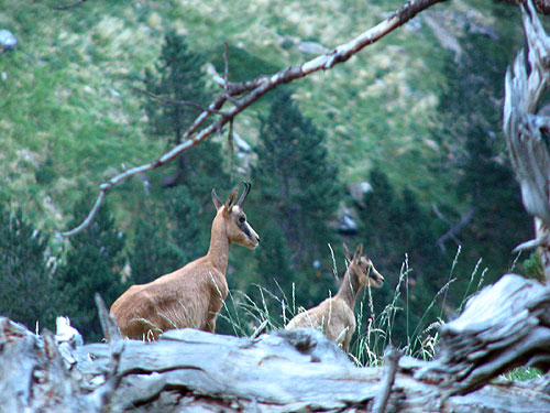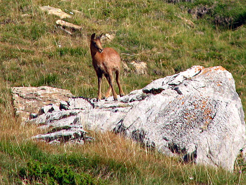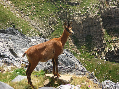 | Acaba la "Faja de las Flores" als plans de Salarons, a 2.349 mts. La natura ens depara un altre gran espectacle, una manada d'isards. Uns als nostres nassos i els altres enfilats a la roca. No els espantem, no els fem por, estan allà observant-nos. Fins i tot ens acompanyen una estona. |