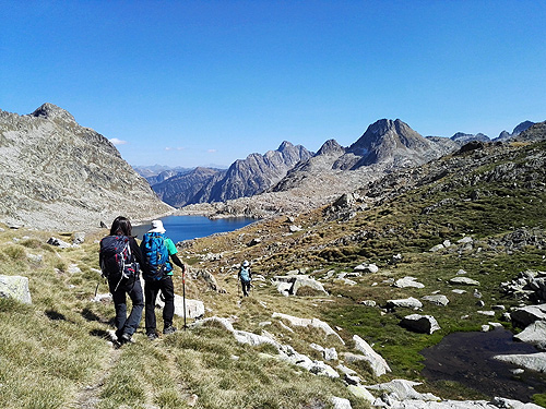 Entres a la vall i el panorama és el d'un circ, per on es passa? La primera part del camí és planer, després en ziga-zaga va guanyant alçada. Es el camí que segueix l'Alta Ruta dels Pirineus (GR-11) i que pel port de Rius ens portaria fins al refugi de la Restanca (també és una de les entrades a la ruta de Carros de Foc). Nosaltres, a mitja alçada ens desviem a l'esquerra per anar primer a l'estany Redon, on fan estudis científics sobre la vida als llacs de muntanya. Entre el llac Redon i el coll no tots els mapes tenen marcat camí però només cal anar pujant i puja dret, molt dret. Ara bé, el panorama des de dalt és una passada. Cap a l'oest l'estany Redon, el Tuc de Conangles, el de la Comtesa i, més al fons, l'Aneto i la seva gelera (fins que li poguem seguir dient gelera). Cap a l'est, l'estany de Rius i els Tumeneixa (els Bessiberris no es veuen). Un cop a l'estany de Rius, agafem el GR-11 i pel port de Rius comencem a baixar fins als cotxes.