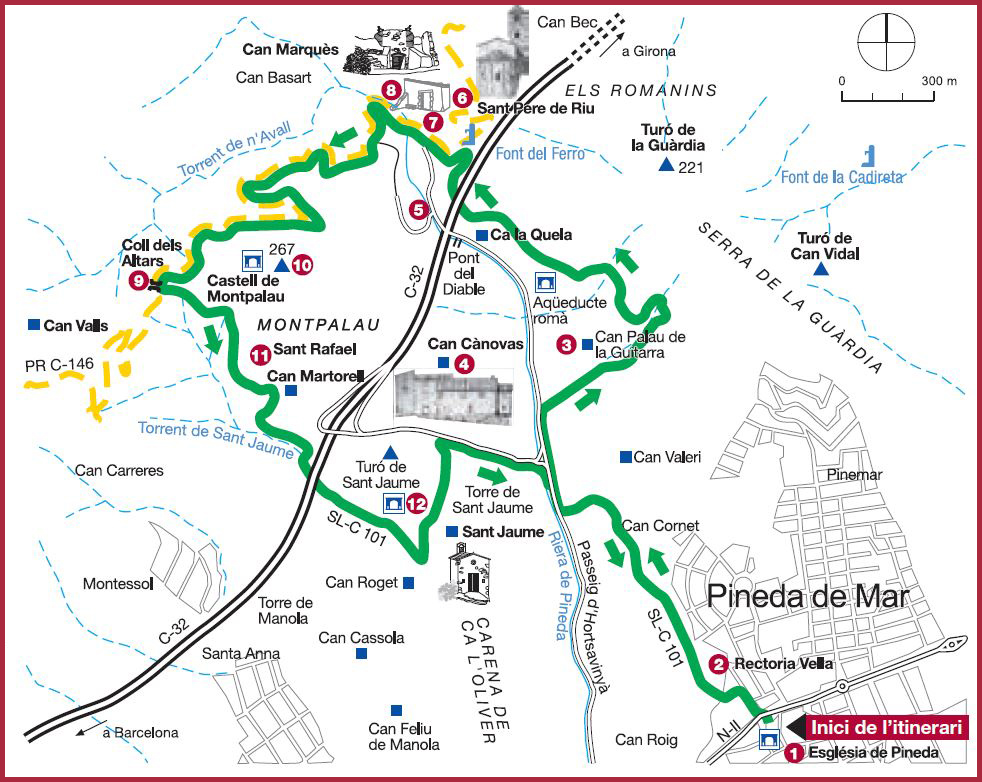 La sortida és des de l'església de Santa María -1- o des d'on pogueu aparcar. Nosaltres ho vam fer a l'altra banda de la N-II al costat de l'escola pública Jaume I. Pel carrer Lluís Vives i d'Eugeni d'Ors arribeu a una pista que és el camí històric de la Rectoria Vella -2-.