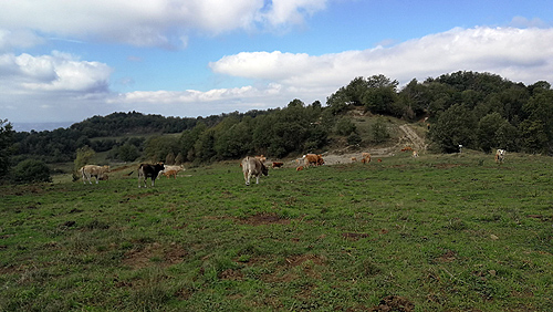. Coll de Rajols. Ample coll que vam trobar ple de vaques. A la dreta aniríem cap al Grau del Perer i Cantonigrós. Més o menys recte i en pla cap al Torrent de l'Avellanosa i Monteis passant per les tombes antropomòrfiques i cap a l'esquerra cap a La Rocallarga