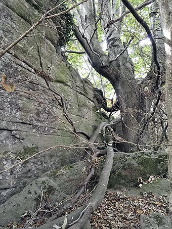 . Roques i arbres. Baixem del Rocallarga i al continuar caminant cap a l'esquerra veiem unes petites llastres (comparades amb el Rocallarga) que formen un paisatge que podríem qualificar de tètric, sembla que s'hagi fet de nit. I, entremig, un faig inmens que semblen tres i que lluita com ningú per buscar la llum del sol.
