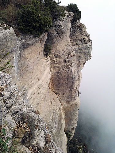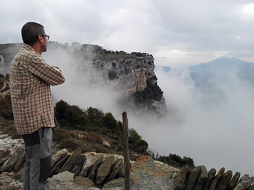 Mirador del Silenci: ample sortint amb vistes sobre Sau, Rupit-Pruit i Sant Joan de Fàbregues. Tornem per la vora del penyasegat, comença a sortir el sol i es comença a esvair la boira.