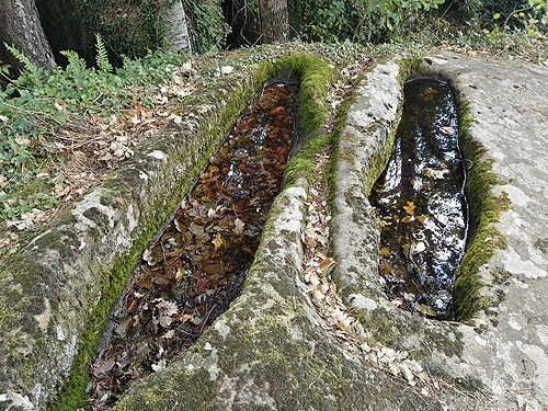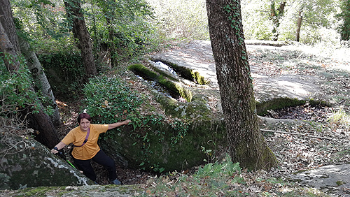 . Tombes antropomòrfiques. Molt interessants, són del tipus "Olèdrola", enterraments excavats a la roca. Aquí també van aprofitar les formes i passadissos que formen les roques per a fer enterraments col·lectius (ara en diríem fossa comuna). Aquestes fosses, anomenades de l'Avenc, daten de l'Edat Mitjans (de l'any 800 al 988) tot i que a la finca on estan se n'han trobat vestigis del Neolític (de 5.500 anys abans de Crist). Un dels tracks que teníem hi passava i el vam seguir però era tot ple d'esbarzers. La tornada al coll la vam fer per un ample camí sense problemes. Per agafar-ho d'anada (això no està al track que us podeu baixar) quan arribeu al Coll de Rajols tireu més o menys en la direcció que portàveu, passeu la tanca dels animals i gireu a la dreta tot anant avall per un espai que els arbres van tancant. En 5 minuts arribareu a les tombes.