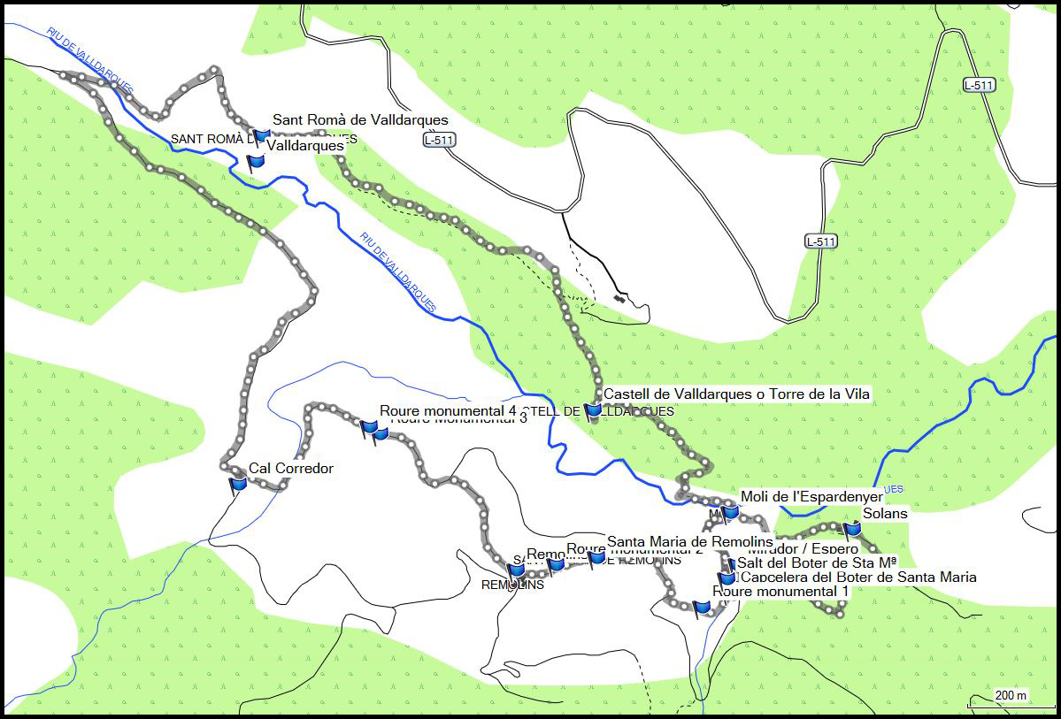 Aquesta ruta passa per diferents punts d'interès dins de Valldarques (17 habitants) que, a la vegada, pertany al municipi de Coll de Nargó. Trobem el nucli de Sant Romà de Valldarques amb l'església romànica del mateix nom, el cementiri adosat, la rectoria enclavada en un penya-segat que fa el riu Valldarques i diverses cases, la majoria abandonades. També hi ha les restes del castell de Valldarques -a sobre del riu-, diverses masies -algunes abandonades, altres restaurades per al turisme i d'altres on encara es viu de pagès, salts d'aigua, cingleres imnenses i roures centenaris. En definitiva, una circular molt interessant des de molts punts de vista. El riu Valldarques ens fa de guia i veiem tot el que ha deixat fet: la vall de Valldarques. I tota la ruta només per a nosaltres, només ens vam creuar amb un vehicle amb dues persones, ningú més.