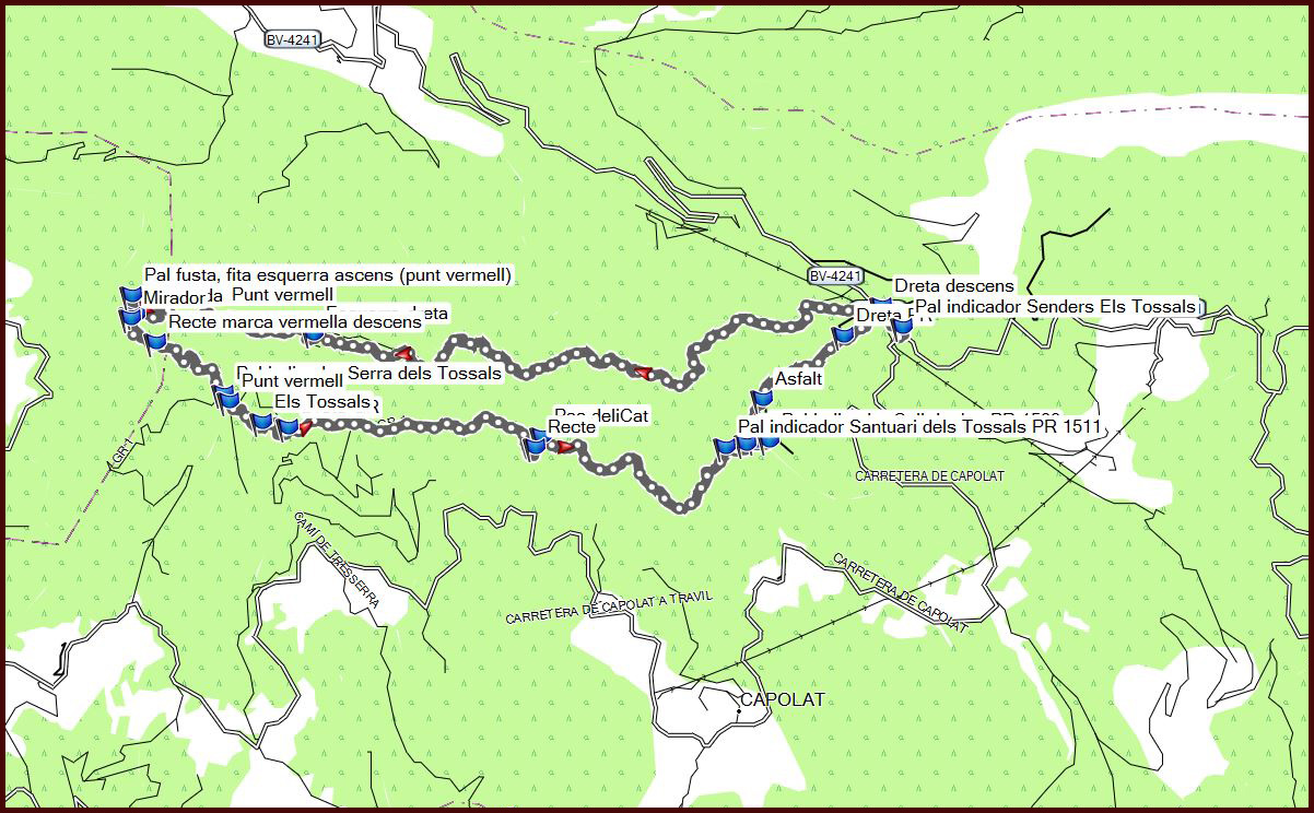 És una bonica excursió pel Berguedà, gairebé al límit amb el Solsonès. Si comences d'horeta o si dines tard, és una matinal. I tot i que només són poc més de 10 quilòmetres, les constants pujades i baixades i l'orografia del terreny fa que el ritme sigui lent. No té gaires dificultats, si de cas, una pujada en la que t'has d'ajudar una mica amb les mans (abans d'arribar al cim) i el Malpas (aquest només si està moll). Preocupa més que hi ha trams (precisament el de la pujada forta) en el qual les marques vermelles estan molt desdibuixades pel pas del temps. Cal està molt al cas del track. |