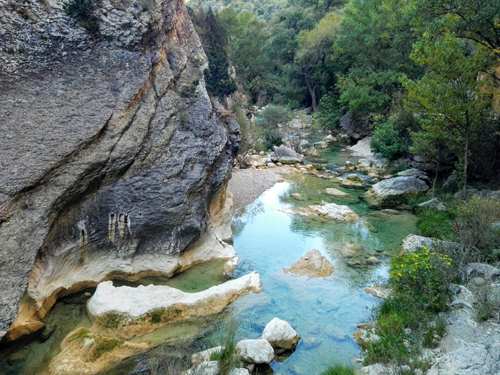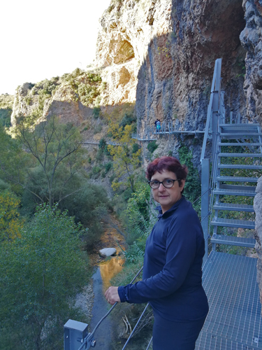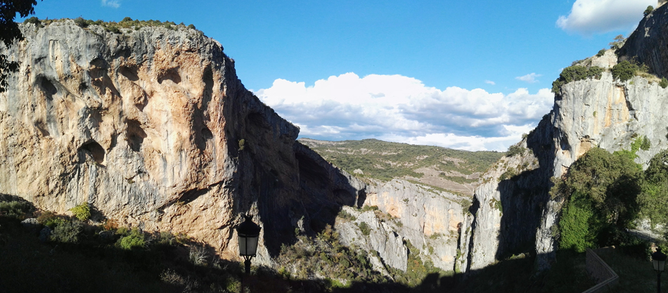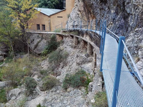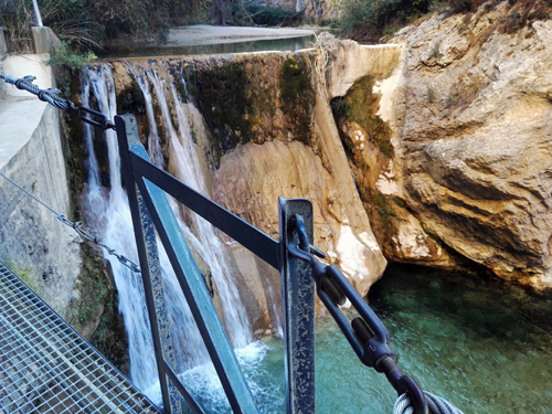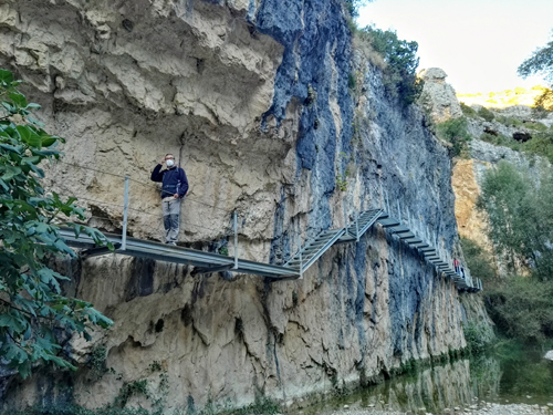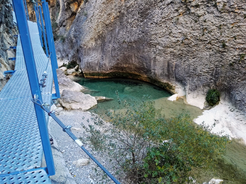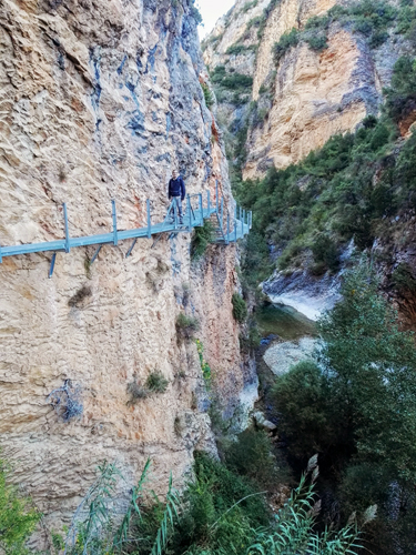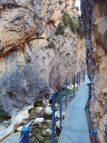 És un dels grans atractius d'Alquézar, a més, per què és molt accessible. En un parell d'hores i sense gran esforç passes per l'Estret del Vero aprofitant unes pasarel·les muntades a sobre del riu. Si des de dalt ja es veu que és una passada, la passejada ho corrobora i, a més, estàs a dins, estàs a sobre. Hi ha unes quantes bassetes a les que et tiraries sense pensar-ho, val la pena anar-hi. El recorregut té el seu origen en els anys 20 del segle passat. Van fer com una represa a la part estreta del riu, entre parets, i una central per aprofitar la força de la caiguda de l'aigua per produir electricitat per al poble. Tenien poques hores al dia i per només una bombeta, pero tenien llum elèctrica. La qüestió era que el responsable de la central (a la que es podia accedir més o menys caminant des del poble) havia d'anar fins a l'azud per obrir, tancar, manenir-lo, etc. I van fer les primeres passarel·les encara visibles sota les actuals. Després la central va quedar abandonada i les passarel·les també, fins que van pensar que podien tenir un ús turístic. Ara tenen dos trams, un fins a la central i el següent -del 2015- fins al mirador. En total, són 3,1 kms i uns 160 metres de desnivell des del poble. L'accés està regulat amb un cupo de 30 persones cada mitja hora. L'entrada val 3€ online i 4€ si la compres a l'entrada o a l'ajuntament que està al costat. Les passarel·les tenen una web pròpia on es poden comprar les entrades i teniu més informació a la web turística del Somontano. |