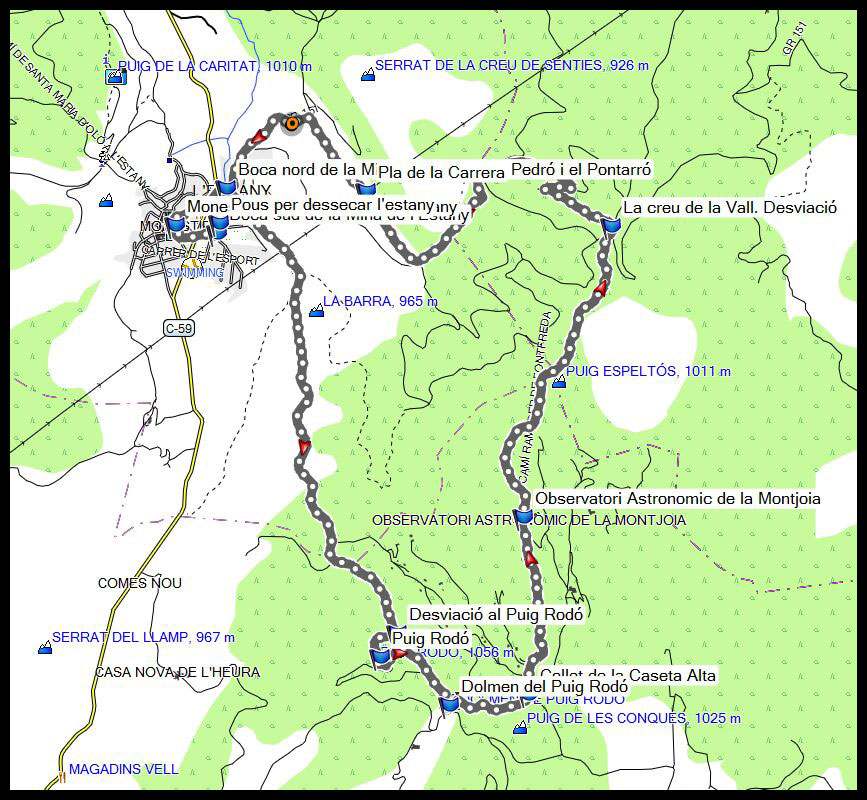 L'Estany es diu així pq temps enrera hi havia un estany a la vora del poble que van assecar per les malalties que provocava. Trobareu la història explicada en aquest enllaç de la web de l'Estany. De resultes d'aquella acció queda la mina d'aigua que van fer servir i que ara serveix per canalitzar l'aigua del Torrent de l'Estany per regar camps. De fet, la ruta surt de la boca nord de la Mina, al costat d'un pont medieval -el Pontarró- i del Pedró -un monument erigit per Guillem de Rocafort el 1668, en agraïment per no haver-se fet mal en caure pel Pontarró quan tornava de Barcelona. També es poden veure (i en un altre època visitar) els pous de ventilació i la boca sud. Al fer aquesta ruta, a més de pujar al Puig Rodó, trobarem el dolmen de Puig Rodó molt ben conservat, l'Observatori Astronòmic de la Montjoia i la font Canaleta. L'Observatori està ara abandonat però aquí, dos astrònoms de l'Agrupació Astronòmica de Sabadell van observar l'asteroide del cinturó principal 1998 QZ15, que desprès va ser anomenat (13260) Sabadell en commemoració del 40 aniversari de l'Agrupació Astronòmica d'aquella ciutat vallesana. Encara que aquest objecte ja havia estat observat prèviament des del 1952 per altres observatoris majors, el seu descobriment va ser adjudicat al de la Monjoia. Berta Solanas |