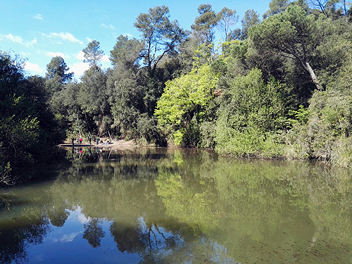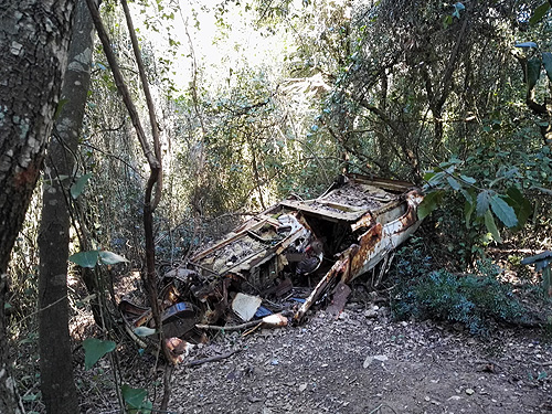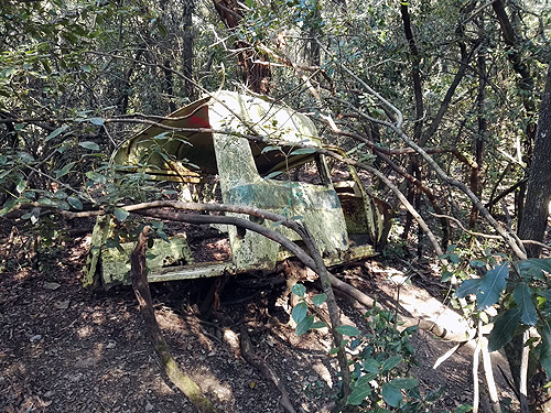 Anem a la cua del petit embassament per i seguim el camí que ens connectarà amb el que anàvem abans. Trobarem dos cotxes estimbats que ara, amb la quantitat de vegetació que hi ha, sembla difícil pensat com hi han arribat.