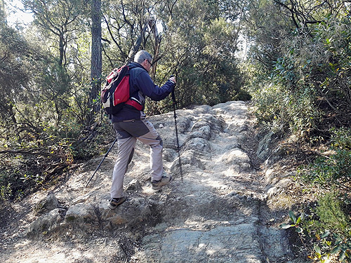 Tornem a la pista per un corriol bastant desfet que baixa molt dret. Creuem la pista per agafar-ne un altre que surt a l'altra banda de la pista que porta a la masia -ara restaurant- de Can Borrell. El camí ara puja per una zona empedrada fins a trobar el trencall a la dreta que ens portarà al pantà de Can Borrell.