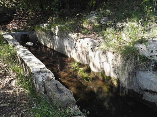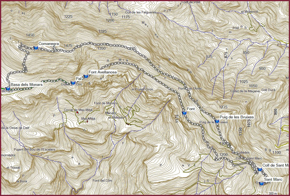 fins al collet de l'Arç. A partir d'aquí diversos camins ens fan perdre i anar cap a través o canviant de camí contínuament. Fins que arribem a un més fressat just d'on surt el que va al Pla de la Vaca i la Cova. (aquest tram no el fem). El seguim cap a l'oest, cap a Monars. Trobem l'abeurador de pic de les Bruixes i la Font de l'Avellanosa.