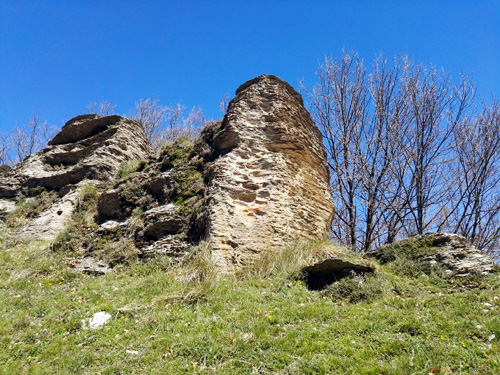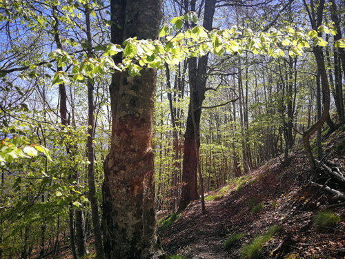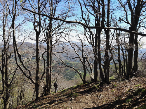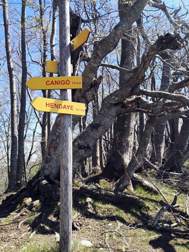 arribem a un pal de senyals francès batejat com a Totem.El camí continua cap a l'est en forta baixada pel vessant nord enmig mig de grans exemplars de faigs fins a la fageda de la Baga de Bordella. Seguim fins al Puig de les Bruixes ara pel vessant sud, ara pel nord, salvant sortints de roca. Però tot el camí éstà molt fressat, difícil perdre-s'hi en aquesta zona.