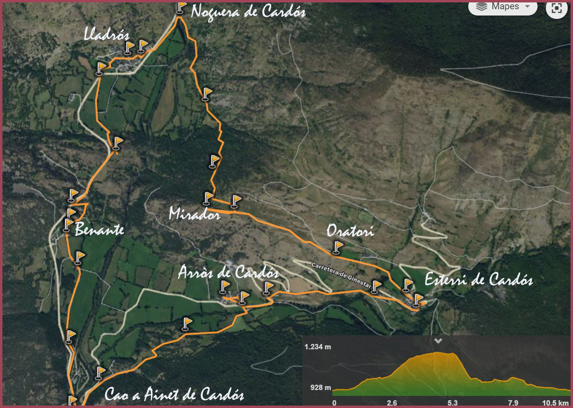 . Ainet de Cardós (on vam deixar el vehicle). Pertany al terme muncipal de Vall de Cardós. . Arrós de Cardós (molt ben arreglat). Pertany al municipi d'Esterri de Cardós. Censades 22 persones, a l'hivern no hi hvieun més dd'una dotxena. . Esterri de Cardós (amb l'església de Sant Pau i Sant Pere amb pintures murals i del frontal al MNAC). Te ajuntament propi del que també forma part Ginestarre i Arrós de Cardós . Lladrós (amb una gran fàbrica de mobles a l'entrada del poble venint de Tavascan i l'esglesia de Sant Pere a dalt del poble). Pertany al terme muncipal de Vall de Cardós . Benante (molt petitet, només 5 cases). Petita ermita romànica de Sant Lliser amb paviment de còdols amb formacions geomètriques. Tancada també. I tots amb el cementiri vell al costat de l'església. La ruta es faria en molt menys temps del que va trigar nosaltres però l'objectiu era tant els camins entre els pobles (que eren molt macos) com els pobles en si mateixos. I a ells vam dedicar moltes estones. Hi ha molt bones vistes de la Vall de Cardós. Berta Solanas |