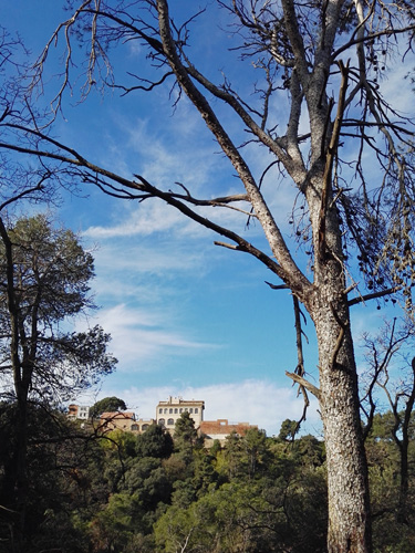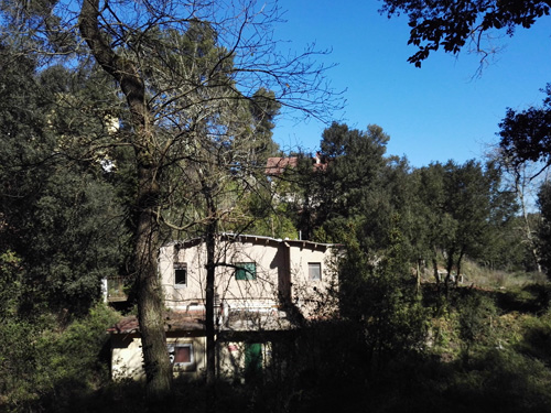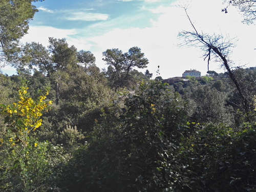 No fem cas d'un camí que surt a l'esquerra i seguim fins a un refugi (bon net per cert) i fins a la font de Can Valldaura. Passada la fort girem a l'esquerra per un corriol que puja dret fins a travessar una pista. Nosaltres tirem recte i ens passem el trencall a les restes del Palau Reial de Valldaura. Seguim per la pista i hem d'estar atents al nou desviament també a la dreta. Per un camí paral·lel a la carretera de Cerdanyola arribem a un nucli de torres i xalets i on hi ha el restaurant de Can Cerdà i la capella de Lourdes. El camí de "zarzas" que marca el track ara no existeix.